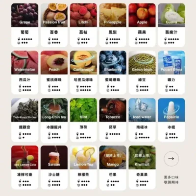 微醺蜜桃, 夏日西瓜, 海鹽檸檬糖, 馥郁芒芒, 麝香葡萄, 荔枝甘露, 冰釀龍井, 桑椹聖代, 爽脆青梅, 奶油烟草, 懷舊冰棍, 綠豆沙沙, 熱帶百香, 清涼薄荷, 零卡養樂多